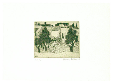 "Griechische Landschaft", Herbert Breiter; Radierung auf Zerkall Bütten, 360gr/m². 20 x 30 cm; 1996 Auflage 25 Stück.