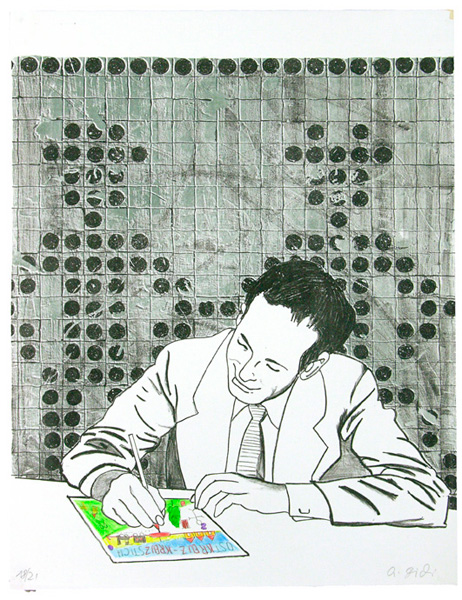 "Kreuzstich am Ostkreuz", Anton Drioli, Lithografie auf BFK Rives Bütten, 250gr/m²; 65 x 50 cm; 2002; 2 Farben von 2 Steinen, koloriert; Auflage 21 Stück.