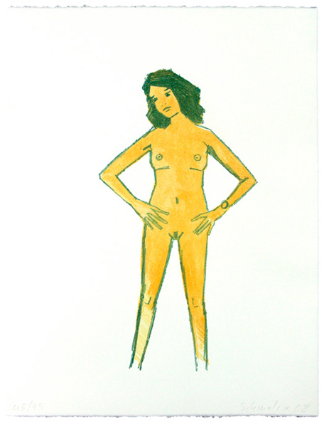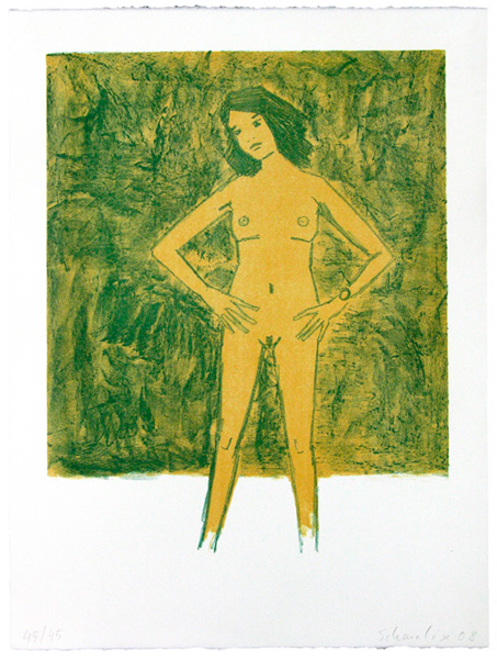 "Salzburg Nude", Hubert Schmalix; Lithografie auf BFK Rives Bütten, 250gr/m²; 65 x 50 cm; 2008; 2 Farben von 2 Steinen; Auflage 45 Stück.
